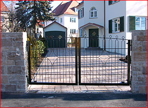 Unsere zweiflügeligen Drehtore werden grundsätzlich mit einem im Stahlrahmen integrierten Seitenanschlag ausgestattet. Durch diese spezielle Konstruktion erübrigt sich der sonst übliche, störende Mittelanschlag am Boden.